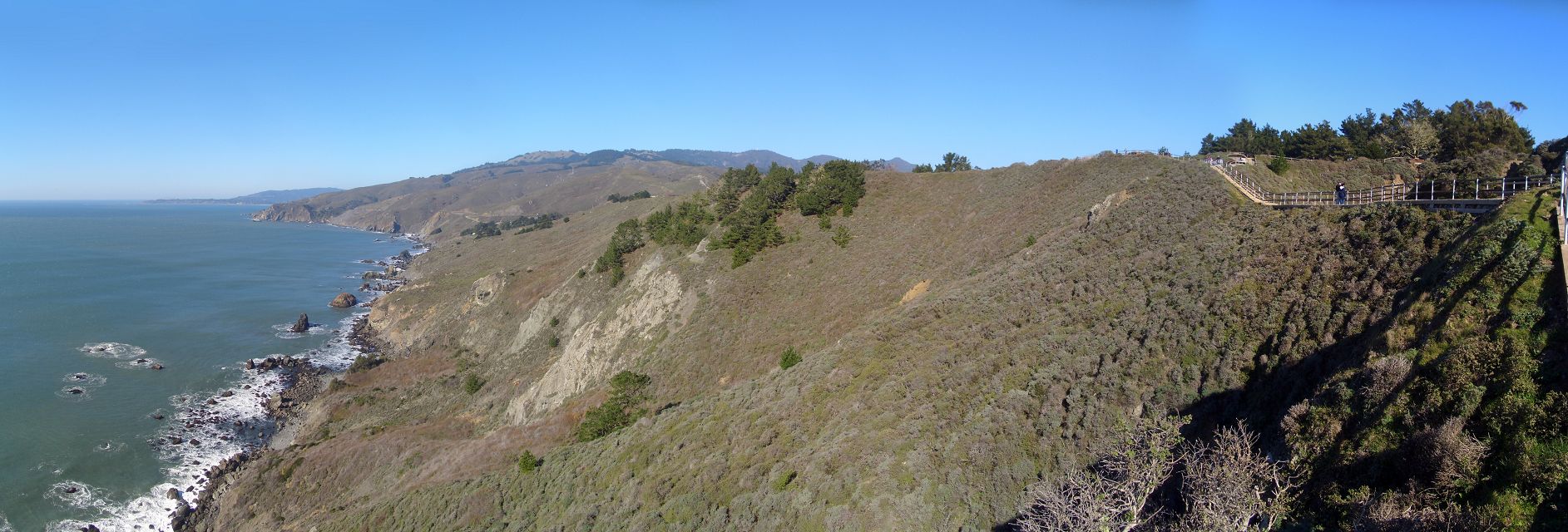 Und auf dem Weg dorthin – ca. bei der Hälfte der Strecke – gibt es auch noch einen der beeindruckensten Aussichtspunkte, den ich je gesehen habe; Muir Beach. Hier mal ein Panorama-Bild, welches wir heute dort gemacht haben: