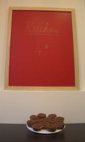 Aber eine andere Sache konnten wir am Samstag erledigen: In der Küche gibt es eine große Einbuchtung in der Wand (direkt über dem Tisch) und wir wollten die Lücke gerne mit einer Schiefer-Tafel füllen. Die handelsüblichen Tafeln waren aber alle viel zu klein. In einem Bastelladen konnte uns geholfen werden: Es gibt eine Art Lack, den man auf eine Holzplatte (unbehandelt!) streicht und dann kann man darauf mit Kreide schreiben. Noch schnell einen Rahmen drum und fertig ist unsere neueste Errungenschaft: