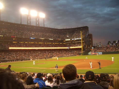 Am letzten Samstag durften wir uns mal wieder so richtig amerikanisch fühlen, denn wir waren zu einem Baseballspiel eingeladen! Zusammen mit Dustin und Iris (die beiden hatten die Karten geschenkt bekommen) haben wir uns unter 34.000 sportbegeisterte Amerikaner gemischt, um die San Francisco Giants gegen das Team aus San Diego spielen zu sehen. Wir hatten tolle Plätze von denen wir die Spieler super sehen konnten. Allerdings waren wir etwas verwundert wie wenig es eigentlich zu sehen gibt: Der Pitcher wirft einen Ball in Richtung des Batter’s und der trifft fast nie. Also wirft der Pitcher noch einen Ball und so geht das endlos weiter, bis endlich mal einer den Ball trifft. Die Mehrheit der Bälle geht dann noch ins Aus, so dass die Geschichte mit dem Werfen weiter geht. Aber ca. zehnmal mussten die anderen Spieler dann doch rennen, um einen Ball zu bekommen und ein Spieler hat sogar einen home-run geschafft!