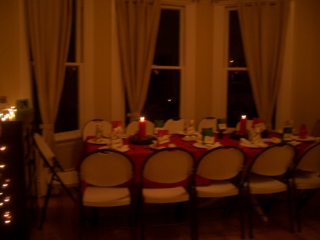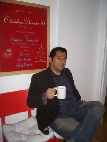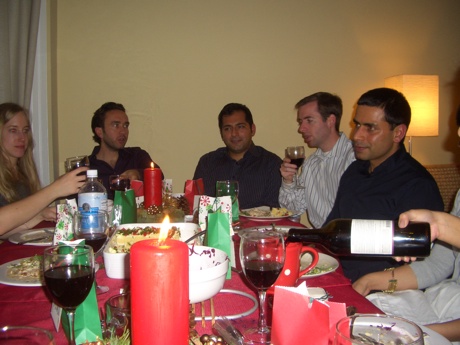 Und noch etwas ist in diesem Jahr anders: Wir werden nicht nur zu Parties eingeladen, wir koennen in diesem Jahr auch Freunde einladen, um schon mal etwas weihnachtliche Stimmung aufkommen zu lassen. Und da wir schon bald die Koffer packen, haben wir am Samstag ein gemuetliches Christmas Dinner veranstaltet. Thomas hat nicht enttaeuscht und sich mit Sahneschnitzel in die Herzen unserer Gaeste gekocht. Ich habe mich um die Getraenke gekuemmert und einen sehr leckeren Gluehwein gekocht! Nach dem Essen haben wir noch gewichtelt, was hier Secret Santa heisst! Ich hatte besonders viel Glueck mit meinem Geschenk – ein echter Snuggi!