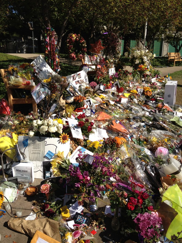 Seit Tagen gehe ich nun an einem provisorischen “Steve Jobs Memorial” vorbei, welches Apple-Fans an einer Bank auf dem Campus angelegt haben. Erst waren es nur ein paar Blumen, dann kamen Apple-Verpackungen mit Worten des Abschieds vorbei, Fotos, Briefe, …. Und immer steht eine kleine Menschentraube davor um Fotos zu machen oder den Berg noch etwas zu vergrößern.